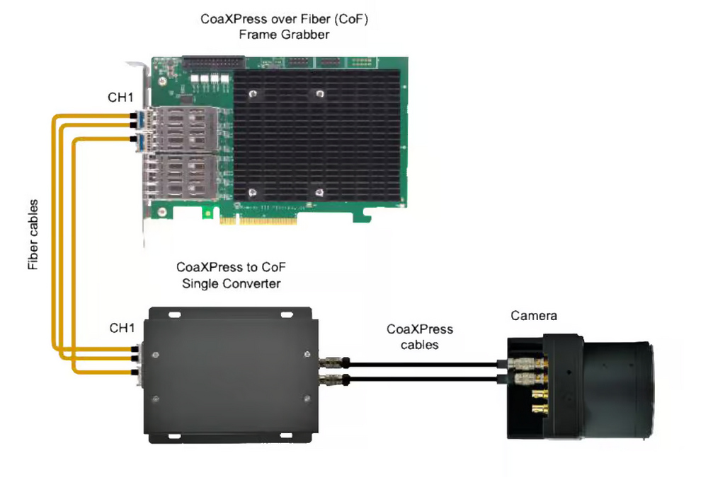 Fiber is electrically isolated, therefore it does not radiate and is not vulnerable to electromagnetic interference, while also eliminating problems related to grounding. Fiber cables are not easily tapped, enhancing transmission security. The CXP-to-CXPoF signal converter uses a standard CoaXPress over Fiber protocol, ensuring compatibility with standard fiber frame grabbers.