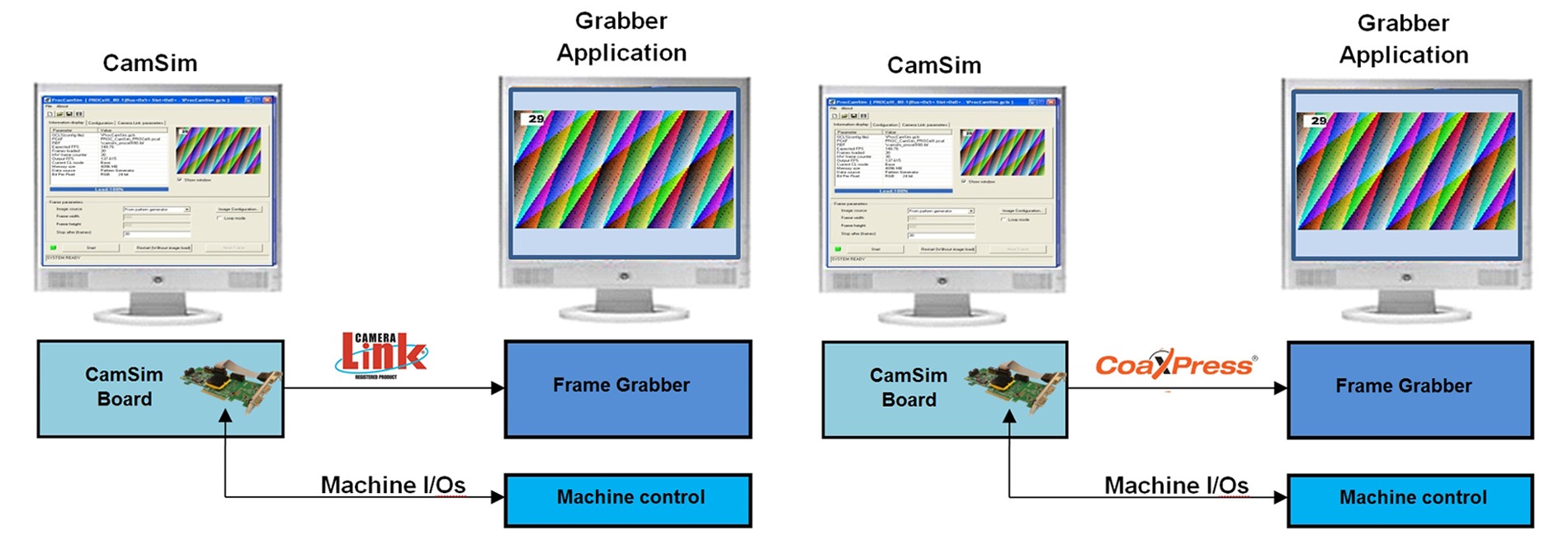 High-performance Gidel PCIe boards designed for reliable camera simulation, featuring dedicated connectors for industry-standard vision protocols.Typical system setup: The CamSim board simulates a camera, sending data to a frame grabber while interacting with machine I/Os for precise hardware synchronization.The CamSim intuitive GUI allows users to configure frame parameters, select image sources (pattern generator or files), and monitor real-time FPS for both Camera Link and CoaXPress interfaces.